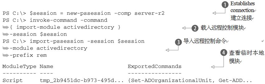 ④ PowerShell在本地计算机创建一个临时模块,用于代表远程命令。这些命令并不是被复制过来的;PowerShell为其创建了指向远程计算机的快捷方式。