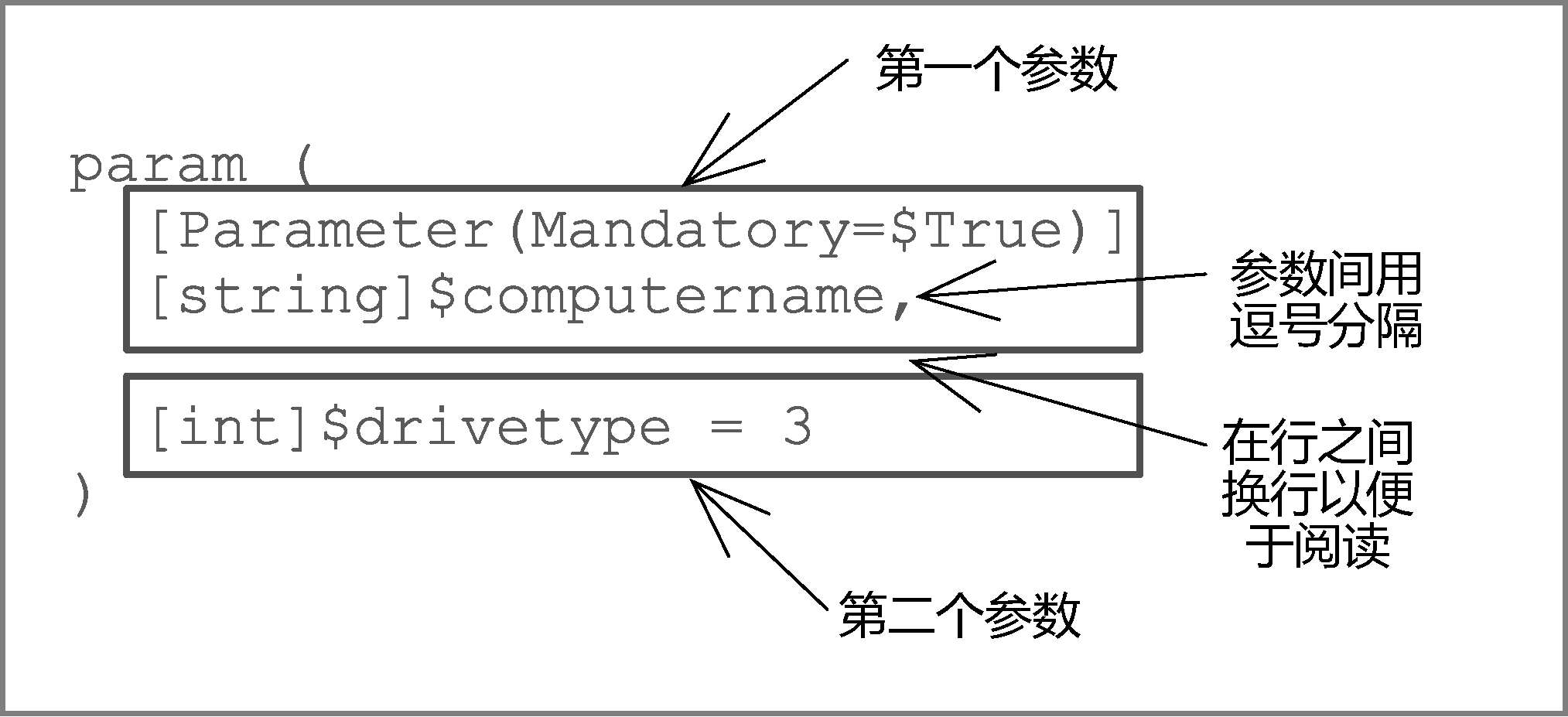 - 我们在定义参数时,就好像参数是变量——$computername和$drivetype——但使用该脚本的人会将其当作普通的PowerShell命令行参数,比如说-computername和-drivetype。