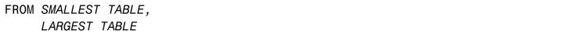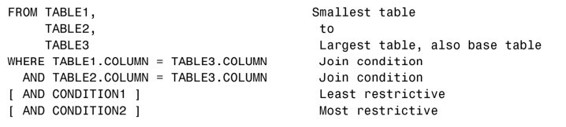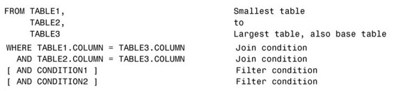 如果没有基表,那表就应该从小到大排列,让最大的表位于WHERE子句里结合操作的右侧。结合条件应该位于WHERE子句的最前面,其后才是过滤条件,如下所示: