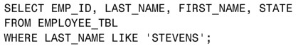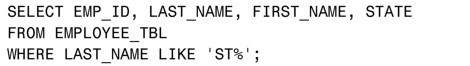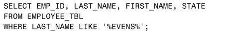 假设我们要编写一个查询,从表EMPOYEE_TBL里选择字段EMP_ID、LAST_NAME、FIRST_NAME和STATE,获得姓为Stevens的雇员ID、姓名和所在的州。下面3个范例使用了不同的通配符。