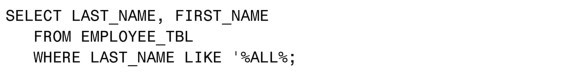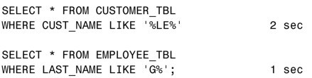 这些SQL语句并不是必须返回同样的结果。更可能的情况是,查询1利用了索引的优势,返回的记录比其他两个查询少。查询2和查询3没有明确指定要返回的数据,其检索速度要比查询1慢。另外,查询3应该比查询2更快,因为它指定了搜索字符串的开头字符(而且字段LAST_NAME很可能具有索引),因此它能够利用索引。