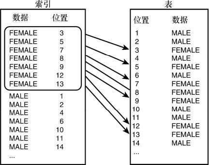 从图16.2 可以看出,在运行上述这个查询时,表与索引之间有一个持续的行为。由于WHERE GENDER = ‘FEMALE’(或‘MALE’)子句会返回大量记录,数据库服务程序必须持续地读取索引、然后读取表的内容、再读取索引、再读取表,如此反复。在这个范例里,由于表里的大部分数据肯定是要被读取的,所以使用全表扫描可能会效率更高。
