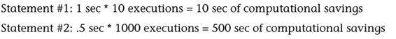 使用这种方法,可以最大程度地获得调整收益。在上面的例子中,如果我们能够将每条语句的运行时间减半,就可以很方便地看出所节省的时间: