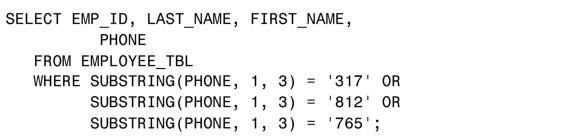 查询1可能会返回姓为Stevens的全部雇员,但难道Stevens不能有其他拼写方式了吗?查询2会返回姓为Stevens及其他拼写方式的全部雇员。查询3返回姓以St开头的全部雇员,这是确保获取全部姓Stevens(或Stephens)的记录的唯一方式。