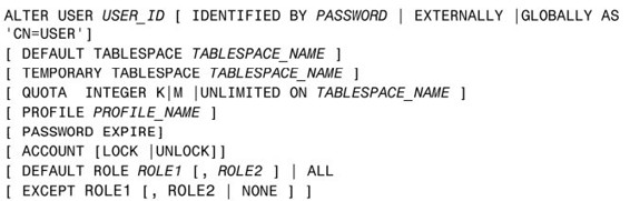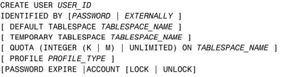 如果不是在使用 Oracle,我们不必过于关注其中的选项。Tablespace(表空间)是容纳数据库对象(比如表和索引)的逻辑区域,是由DBA管理的。DEFAULT TABLESPACE指定用户在创建对象时所在的表空间,而TEMPORARY TABLESPACE是用于排序操作(表结合、ORDER BY、GROUP BY)的表空间。QUOTA是被限制在用户所访问的特定表空间上的空间,而PROFILE是指派给用户的数据库特征文件。