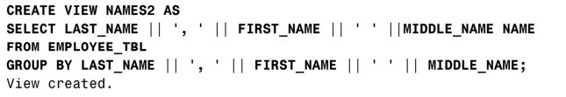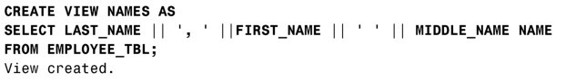 下面的范例展示了如何利用基表里的多个字段组合成视图里的一个字段。利用SELECT子句里的别名,我们把视图字段命名为NAME。