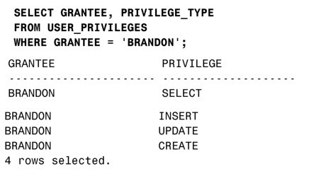 下面的查询返回数据库用户BRANDON的全部系统权限: