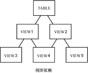 图20.2展示了视图基于表和其他视图的情况。VIEW1和VIEW2基于TABLE,VIEW3依赖于VIEW1,VIEW4依赖于VIEW1和VIEW2,VIEW5依赖于VIEW2。根据它们的关系, 我们可以得出以下结论: