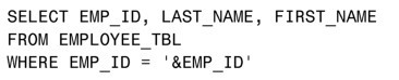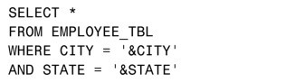 前面这个SQL语句会提示输入EMP_ID,然后返回EMP_ID和对应的LAST_NAME、FIRST_NAME。下面的语句提示我们输入城市和州,返回居住在指定城市和州里的雇员的全部数据。