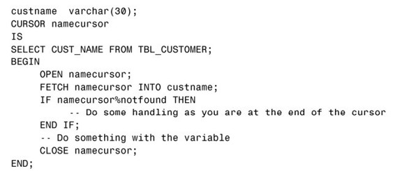 在从光标获得数据时,需要注意可能会到达光标末尾。不同的实现使用不同的方法来解决这个问题,从而避免用户在关闭光标的时候产生错误。下面是一些伪代码实例,显示了MySQL、Microsoft SQL Server和Oracle如何处理这种情况,帮助读者理解光标的处理过程。