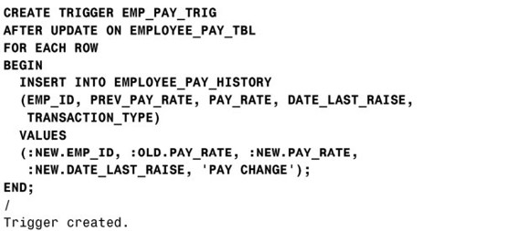 前面的范例创建了一个名为EMP_PAY_TRIG的触发器,每当表EMPLOYEE_PAY_TBL里的记录被更新时,它就会在表EMPLOYEE_PAY_HISTORY里插入一条记录。