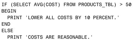 这是个很简单的Transact-SQL语句,它表示如果表PRODUCTS_TBL里的平均价格大于50,就显示“LOWER ALL COSTS BY 10 PERCENT”,否则就显示“COSTS ARE REASONABLE”。