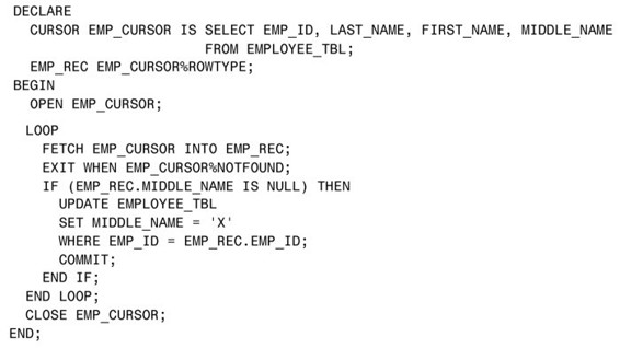 这个范例里使用了三个部分里的两个:DECLARE和PROCEDURE。首先,用一个查询定义了一个名为EMP_CURSOR的光标;然后声明了一个变量EMP_REC,与光标里每个字段的数据类型(%ROWTYPE)相同。PROCEDURE部分(在BEGIN之后)的第一步是打开光标,然后使用 LOOP命令遍历光标里每条记录,结束于 END LOOP语句。光标里的全部记录都会更新到表EMPLOYEE_TBL。如果雇员的中间名是NULL,更新操作会把中间名设置为“X”。更新被提交到数据库,最后光标被关闭。