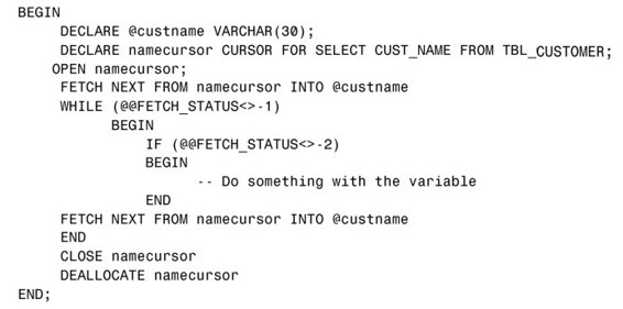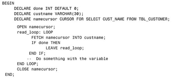 在从光标获得数据时,需要注意可能会到达光标末尾。不同的实现使用不同的方法来解决这个问题,从而避免用户在关闭光标的时候产生错误。下面是一些伪代码实例,显示了MySQL、Microsoft SQL Server和Oracle如何处理这种情况,帮助读者理解光标的处理过程。