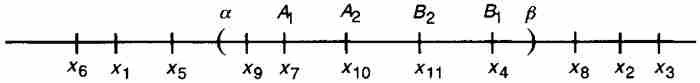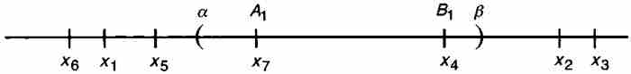 撇开这种情况不谈,假定区间(α, β)至少包含序列中的两个点。这时我们来确定其中的前面两项,即具有最小下标的两项。我们用A1表示较小的项,用B1表示较大的项。这个步骤在图11-1中说明。请注意,序列的起初几项落在(α, β)之外,但是x4和x7落到区间内。按照我们的定义,A1 = x7(较小的项),B1 = x4(较大的项)。