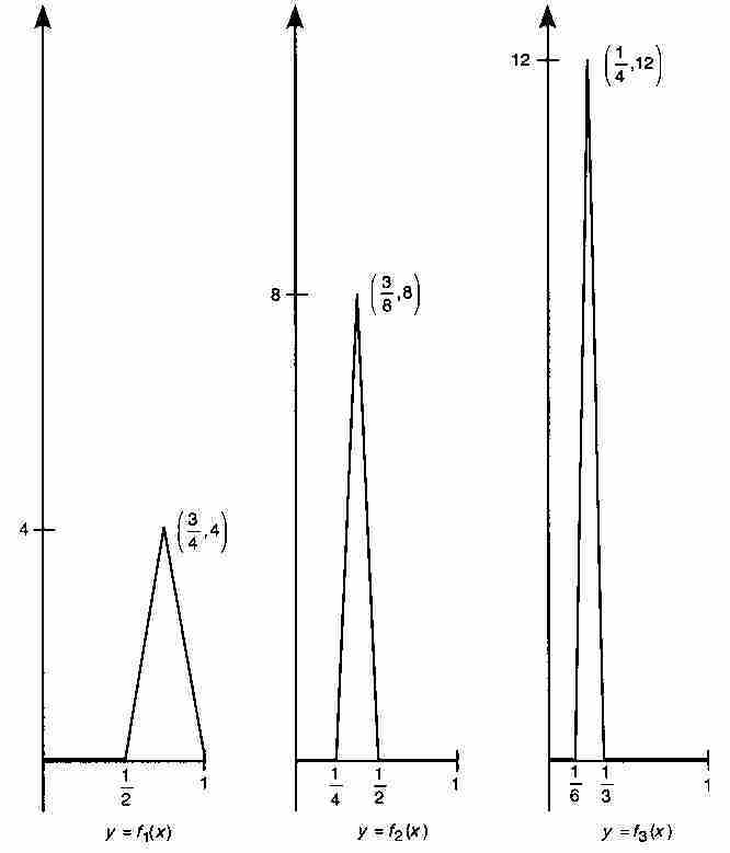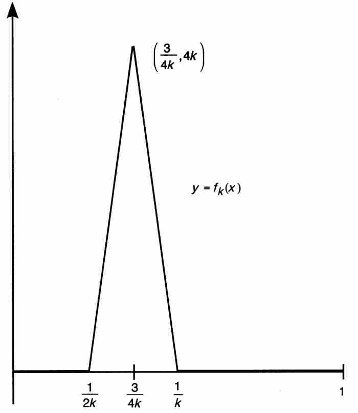 。这个函数表达式尽管看起来也许令人生畏,不过图9-4中的f1,f2和f3的图形显示,这些函数是非常平常的。每个fk(x) 都是连续函数,它们的“尖峰”在越来越靠近原点的区域上变得越来越高,但宽度越来越小。
