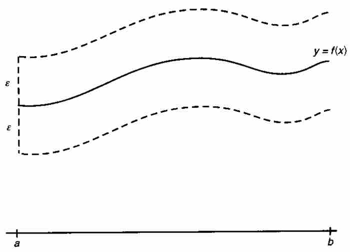 中的fN以及其后的所有函数全部落入这个带状区域。正如一致收敛这个名称所显示的,这样一些函数在区间[a, b]上一致逼近f。