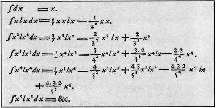 ,“所有含自然对数lx或lx任意乘方的项都化为零,因为1的对数等于零”。6 这是很精彩的,但是现代读者可能感到困惑,因为他没有提及代入x = 0会产生像