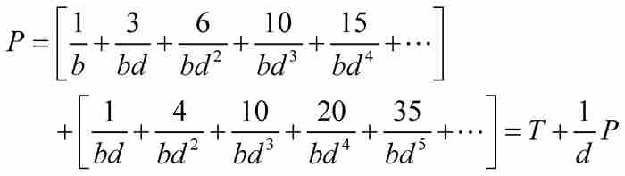 的精确和,其中,分子a, b, c, …, d, …是垛积数,而分母A, B, C, …, D, …构成等比数列。例如,他想要计算