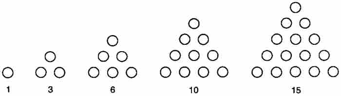 等差数列和等比数列并不是17世纪的数学家们唯一熟悉的数列形式。他们也熟悉“垛积数”,这是同某些几何形体(如三角形、棱锥体和立方体)相关的整数的家族。例如我们有三角形数1, 3, 6, 10, 15, …,这样命名是因为它们来源于图3-1所示的不断扩展的三角形中的点数。容易看出,第k个三角形数是