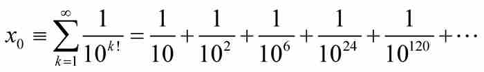 第二步,我们断言x0是无理数。这一点是明显的,因为它的十进制小数表示为0.110 001 000 000 0…,其中的非零位分别是由1占据的小数后的第1位,第2位,第6位,第24位,第120位,等等,这些日渐孤单的1由越来越长的一串0分隔开来。显而易见,在这种十进制小数的展开式中,没有一段有限的数字是重复的,所以x0是无理数。