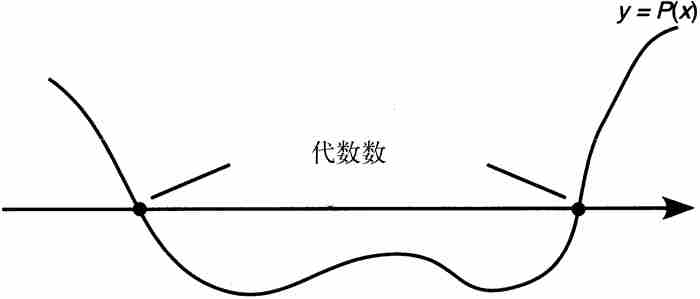 的图形的x截距,其中P是一个具有整系数的多项式(参见图8-1)。如果设想在同样的坐标系中画出系数为整数的所有线性式、二次式和三次式以及一般情况下的所有多项式的图形,那么它们的x截距的无穷集合都是代数数。