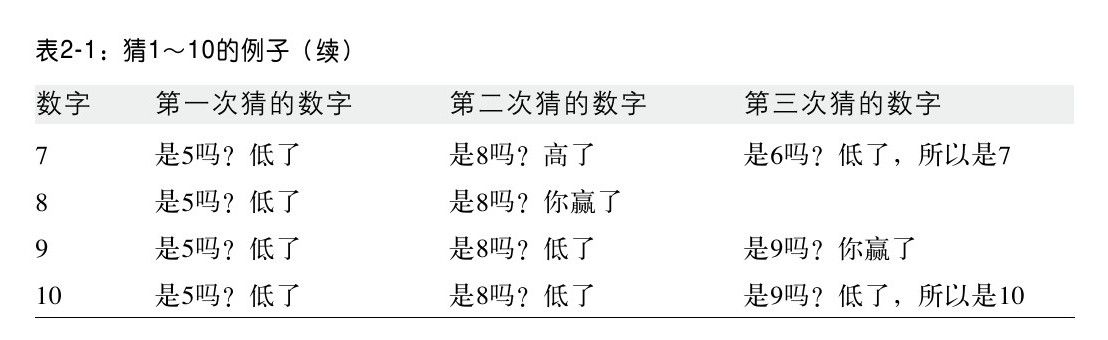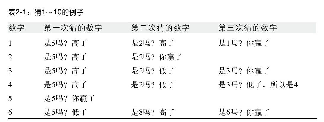 一个酒保和顾客打了一个10 000美元的赌。“我将选择一个从1~1 000 000的数字,然后你能够每次猜1个数字,共猜20次;每一次猜过之后,我将会告诉你高了,低了或者是你赢了。如果你能在20个问题之内赢,我给你10 000美元,否则你给我10 000美元。”你会打这个赌吗?你也许会,因为你可以一直赢下去。表2-1给了一个场景,不过候选数字是从1~10。问一系列的问题,并且每个问题都把候选数据缩减了一半。
