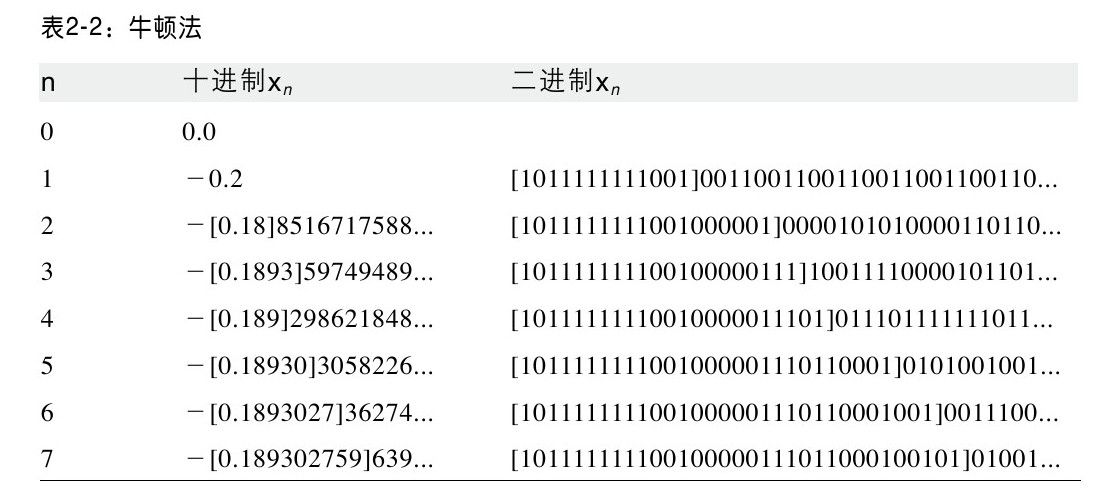 另外一个例子中则展现了牛顿法如何高效地解决一元方程(也就是说,x取什么值,使得f(x)=0)。解x*sin(x)-5*x=cos(x),设f(x)=x*sin(x)-5*x-cos(x),其导数为f'(x)=x*cos(x)+sin(x)-5-sin(x)=x*cos(x)-5。牛顿迭代计算出xn+1=xn-f(xn)/f'(xn)。开始猜测x等于0,这个算法能够快速地给出一个正确解,x=-0.189302759,见表2-2。被用括弧围起来的二进制和十进制数表示精确位。