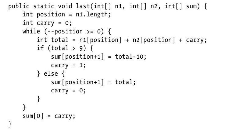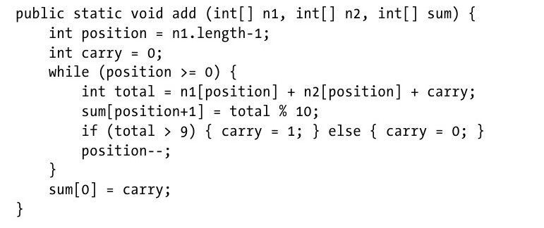 只要这个输入数据能够被存储在内存中,add就能够使用两个int数组n1和n2来计算两个数的加法。例2-3有一些小改动,这个实现能够更加高效吗?