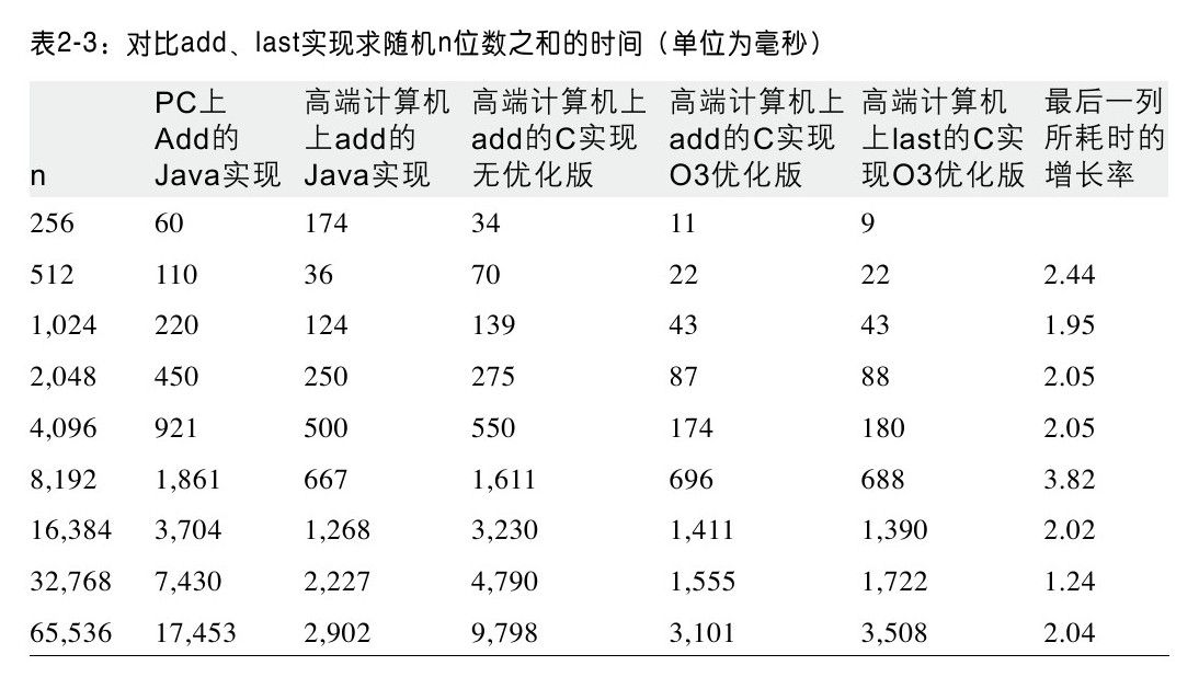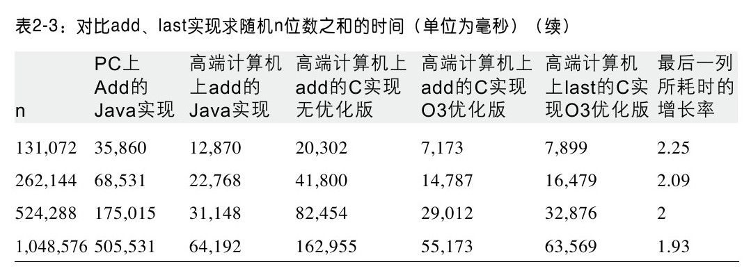 表2-3包含了一些图上的数据。本书中提供的代码都会提供这种信息。表2-3的第6行、第7行和最后一行直接对比了HighEnd-C-Last-O3实现[1]在不同数据规模下的性能。性能的比率与预想的很接近,在2左右。假设t(n)是在数据规模为n的情况下,加法算法的实际运行时间。这个增长模型提供了强有力的证据,证明在高端计算机上,使用C语言并且执行O3级优化,计算n位数之和的时间将会在n/11到n/29之间。