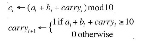 有一些问题的解决看起来明显地需要更多的工作。任何一个8岁大的孩子都知道7+5等于12。那么难一点的问题,37+45呢?一般来说,相加两个n位的数(an……a1+bn……b1)得到一个n+1位的cn+1……c1数字有多难?相加算法使用了如下的原生操作: