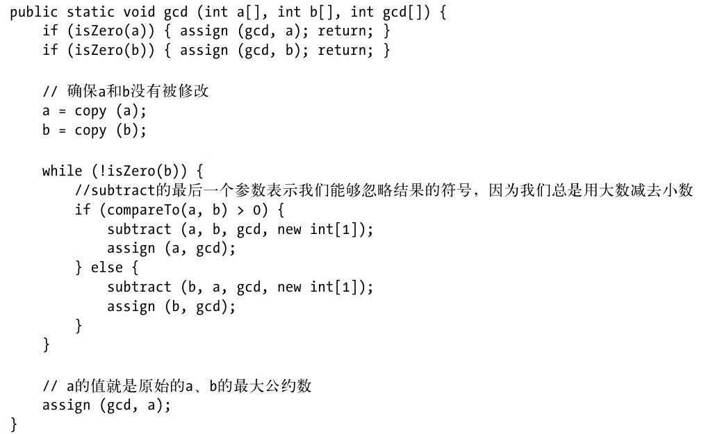 这个算法不断地比较a和b,然后用大数减去小数直到得到0为止。这个实现的辅助函数(isZero、assign、compareTo和subtract)没有在这里给出,不过能够在代码库中找到。