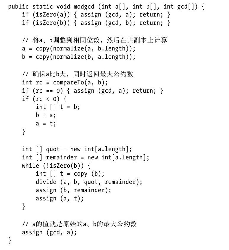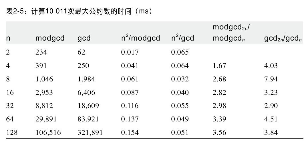 例2-6中MODGCD算法的性能要比例2-5的gcd实现好得多,这个算法使用取模计算一个数模b的余数。
