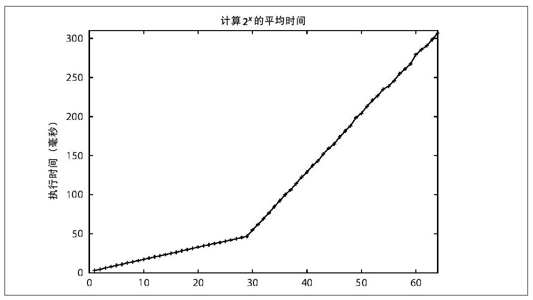 图 2-8 计算2x的执行时间求2的幂计算的性能初始很明显是线性。但是,一旦x达到30左右,出现了另外一种线性关系。由于某些原因,数是2的幂且比30大时,性能会发生改变。