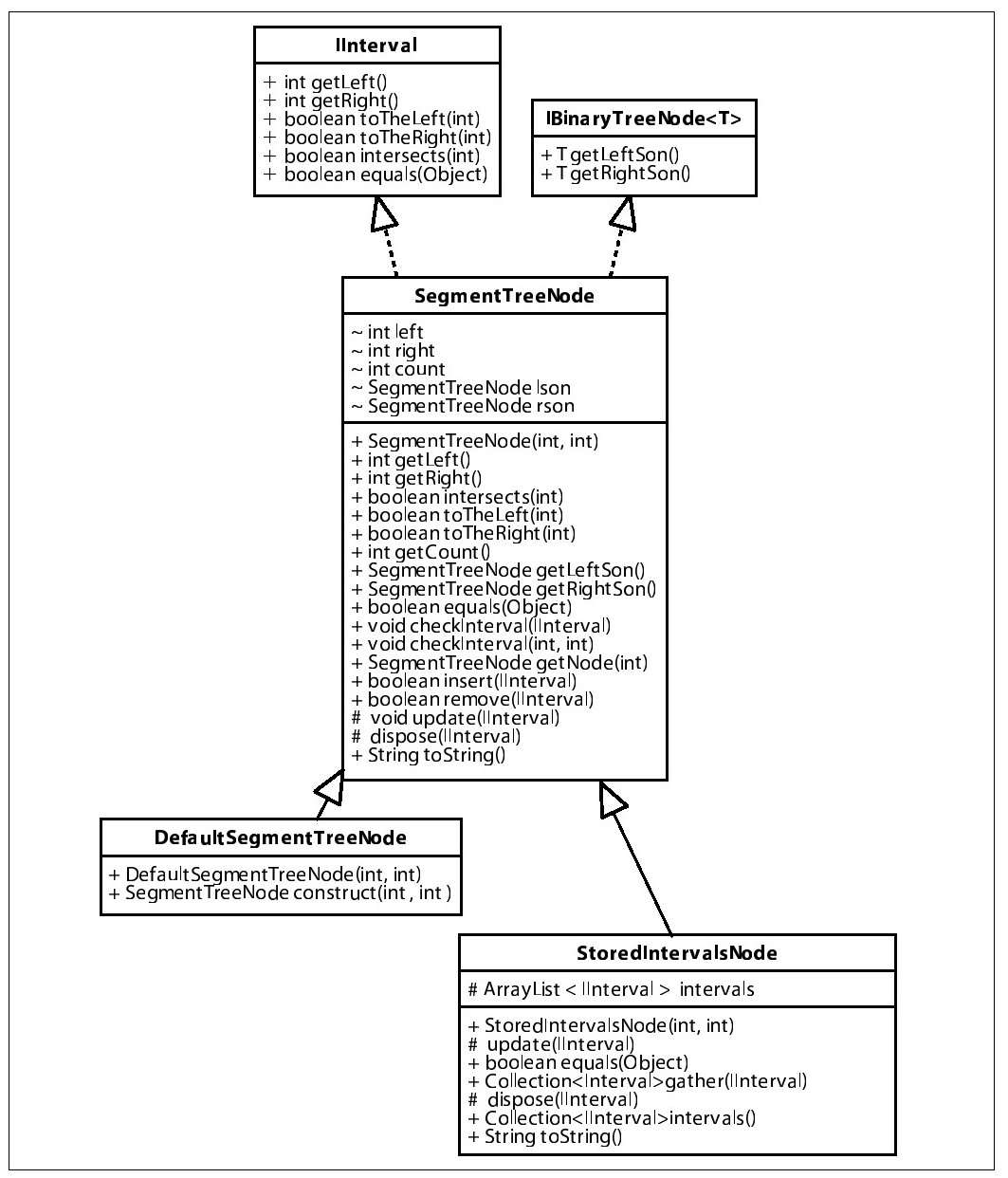 在Java中,类和类实现的接口之间有一种特殊的关系。例如,如果SegmentTreeNode实现了IInterval,那么SegmentTreeNode必须实现IInterval中的方法。这种关系在图3-3中用一个带箭头的细虚线描述出来。