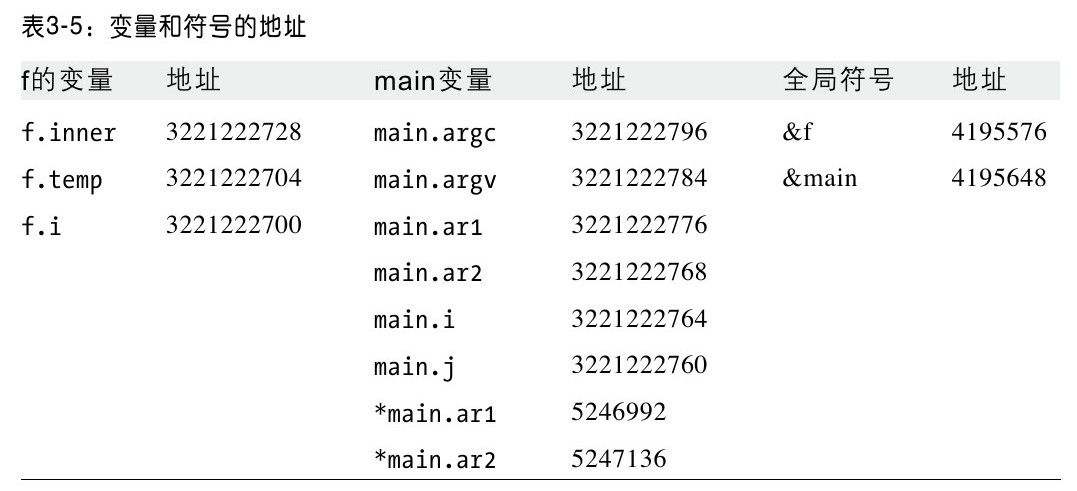 当程序执行的时候,函数的局部变量(如main的argc和argv)都是在执行栈中,执行栈存储的是程序执行的过程。动态分配的内存(如main中的a r1)是存储在堆中的,堆是内存的一块单独区域,用来进行存储空间的分配。变量的地址表示哪儿能够寻找到存储的空间。表3-5表示了一个可能的变量赋值过程(在Linux i686平台上)。