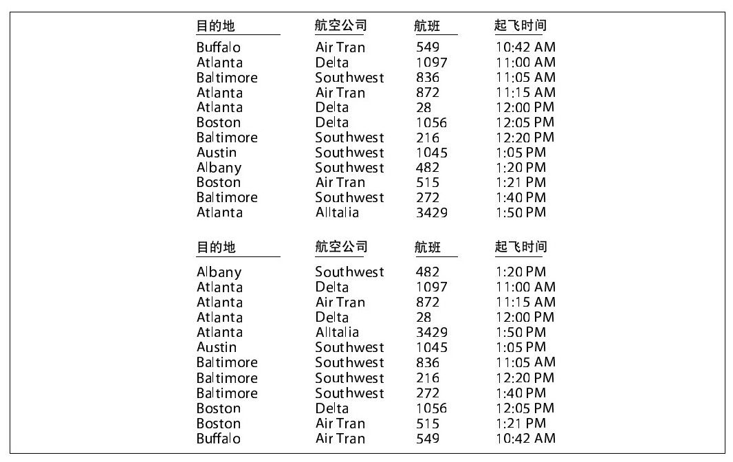 图 4-4 机场候机楼信息的一个稳定排序你将注意到所有具有相同到达地点的航班按照既定离港时间排好序了,因此,这个排序算法是稳定的。一个不稳定的算法不会关注原始集合中的元素位置之间的关系(也许它会维护相对顺序,也许不会)。