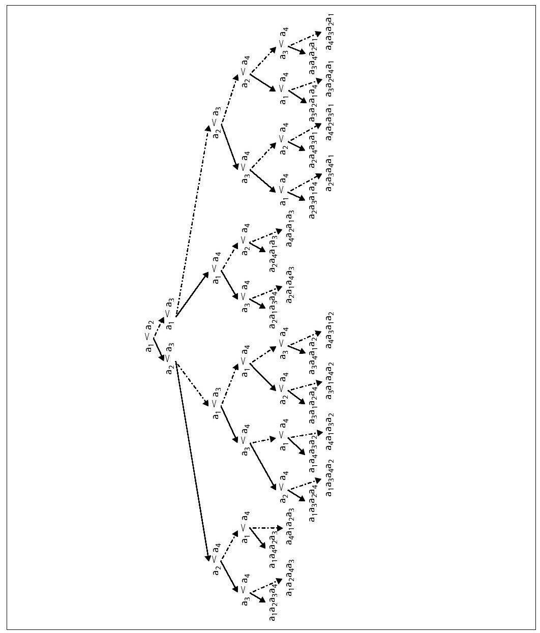 图 4-5 对四个元素进行排序的二叉决策树构建一个二叉决策树,使得每个内部节点表示一个ai≤aj的比较行为,叶子表示n!的一个排列。对一个含有n个元素的集合进行排序,从根节点开始向下遍历,对在每一个节点中的表达式进行求值。如果表达式为真则向左遍历,否则向右遍历。图4-5表示了一个有四个元素的决策树。