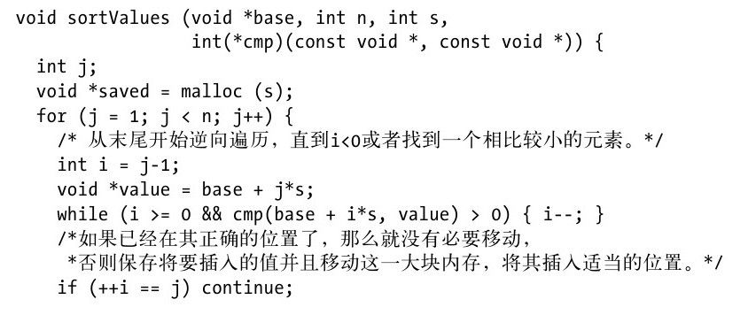 当数据使用指针进行存储时,例4-1的C程序对一个数组ar进行排序,并且其中的元素可以用提供的比较函数cmp进行比较。 例4-1:基于指针的插入排序 当A是基于值的形式存储时,这个数组被装入n行,并且分配给它一个固定大小的内存s。使用比较函数对值进行比较,也就是将值从一个位置复制到另外一个位置(比较函数的栈中)。例4-2给出了一个C程序,这个程序使用了memmove来高效地移动数据。 例4-2:基于值的插入排序