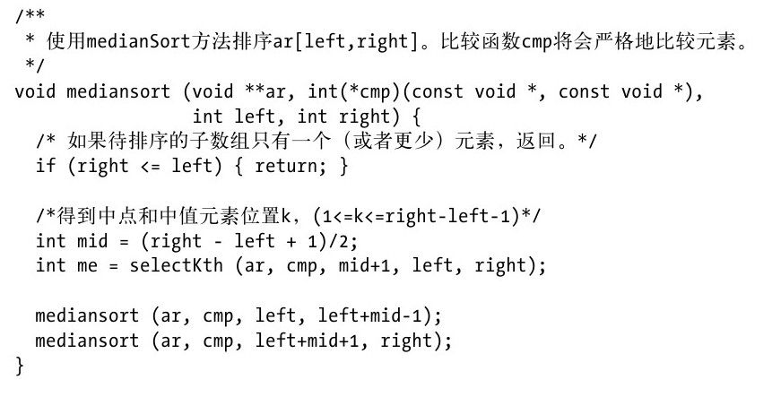 现在将讨论回到中值排序上来,你也许会非常惊讶,因为注意到无论pivotIndex的值是多少,selectKth都能很好地运行。而且,当selectKth返回的时候,不需要执行中值排序算法的第5~8行代码(图4-8),因为切分已经完成了。也就是说,左半部的元素都是小于或者等于中值的,反之,右半部的元素都是大于等于中值的。 例4-5的中值排序函数将要对A[0,n-1]进行排序。 例4-5:中值排序的C语言实现
