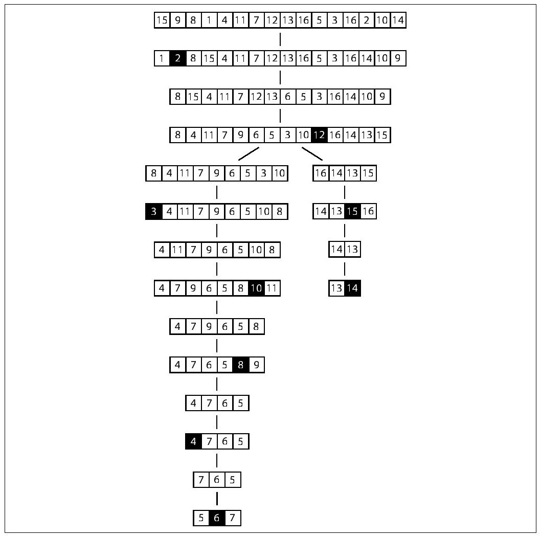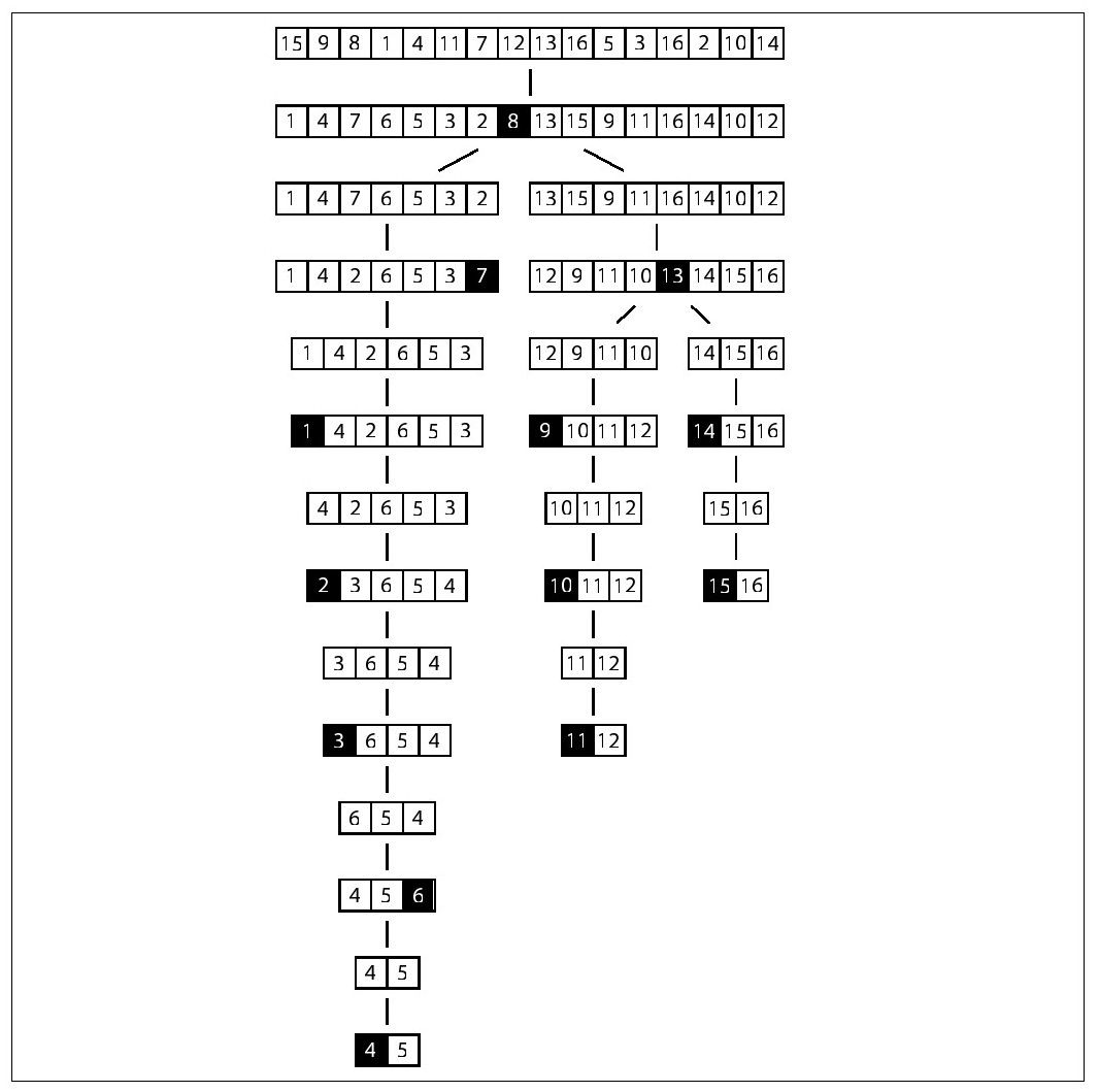图4-12中的是快速排序的行为。图中的黑色方块表示切分函数第一行中的中枢值。选择的第一个中枢值是“2”,这是一个质量比较差的选择,因为这个值将数组切分成两个数组,一个大小为1,另一个为14。在下一次快速排序的递归调用,右边数组中的“12”被选中作为中枢值,这个中枢值切分成两个大小为9和4的子数组。在这里,你已经可以看到使用切分的好处,因为数组中的最后四个元素是最大的四个。因为中枢值选择的随机性,所以会有很多不同的行为。在不同的执行过程中,如图4-13所示,第一次选择的中枢值精确地将这个问题细分成两个可比较的问题。