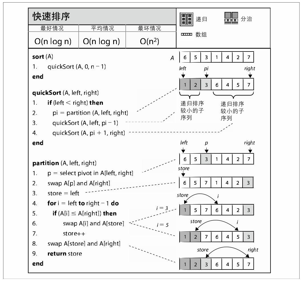图 4-11 快速排序详解就像描述的那样,此算法的随机性使得我们很难证明平均情况下的性能仍然为O(nlogn)。在这里我们不会介绍得到这个结果所使用的高级数学分析工具,更多的细节在Cormen等(2001)中可以找到。