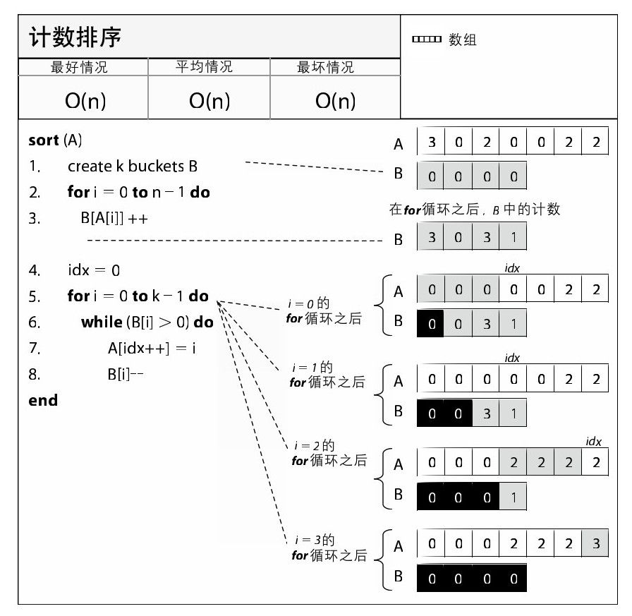 计数排序,如图4-17所示,不需要一个比较函数,是对范围固定在[0,k)的整数排序的最佳选择。即使k个元素的全序能够被决定以及每一个元素的值都是唯一的,这个算法也可用。例如,如果排序一系列形如1/p(p为整数)的小数,p的最大值为k,那么每个小数1/p能够被分配一个唯一的值k-p。