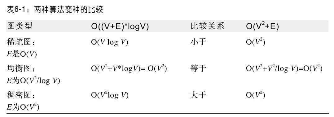 我们将会看到,根据图的结构,一些算法会有两个变种,并且这两个变种的性能不尽相同,一个变种也许执行时间为O((V+E)*logV),而另外一个是O(V2+E)。哪个更加高效呢?表6-1告诉我们这个答案取决于图G是稀疏图还是稠密图。对于稀疏图来说,O((V+E)*logV)显然更加高效一些,而对于稠密图,O(V2+E)就更加快速了。标记为“均衡图”的条目,这种图的期望性能在稀疏图和稠密图上都是相同的,为O(V2),在这些图上,边的数目大致等于O(V2/log V)。