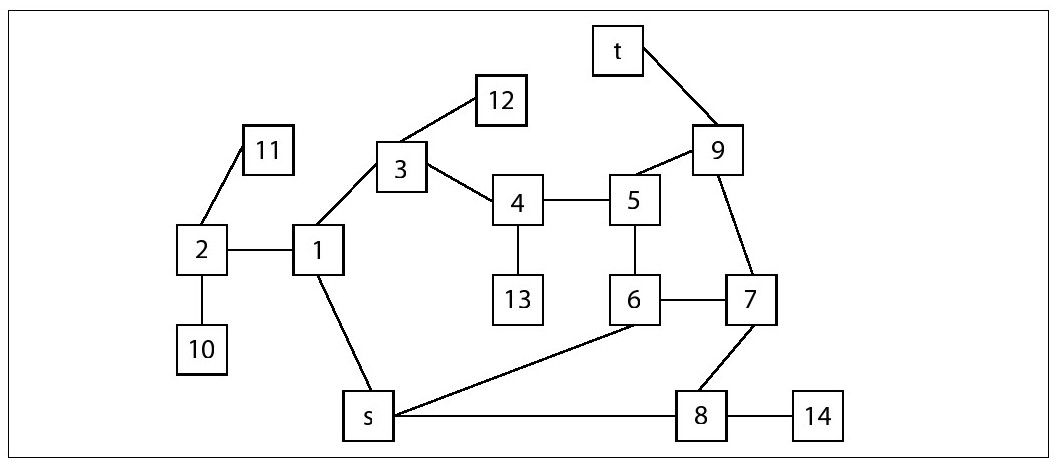 图 6-7 从s到t的一个小迷宫我们能够用一个包含了点和边的图来表示图6-7的迷宫。一个顶点表示迷宫中的每一个分支点(在图6-7的右边用数字标记),当然也包括“末路点”。如果迷宫中在两个顶点之间存在一条有向路,并且在这个方向上没有其他的选择,那么我们就说存在一条边。从图6-7得到的迷宫的无向图表示如图6-8所示,每一个顶点都有一个唯一标识符。