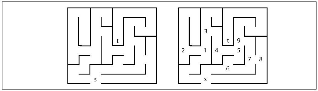考虑图6-7左边的迷宫。在经过一些尝试后,一个孩子能够快速地找到从起点s到终点t的路。但是计算机解决这个问题看起来就比较复杂,一种方法是假设离目标并不太远,然后做尽可能多的深度移动。也就是说,只要可以,随机选择一个方向,然后向这个方向前进,标记一下起点。如果你走上一条死路,或者不能在不重新访问顶点的情况下做任何深度移动,那么就会退到另一条未访问的分支上,并且向这个方向前进。图6-7右边的数字表示的是一个解的分支点;事实上,在这个解中,我们访问了迷宫中的所有点。