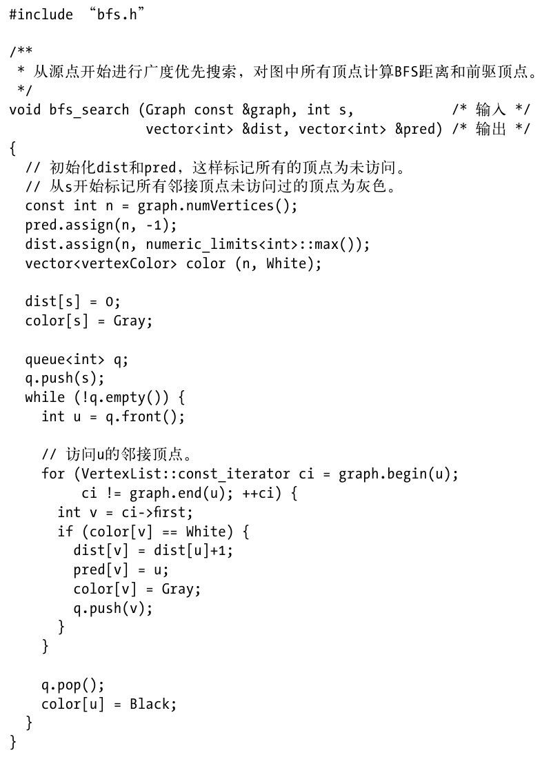 例6-2是广度优先搜索的C++实现。广度优先搜索在栈中存储其状态,因此不需要任何的递归调用。