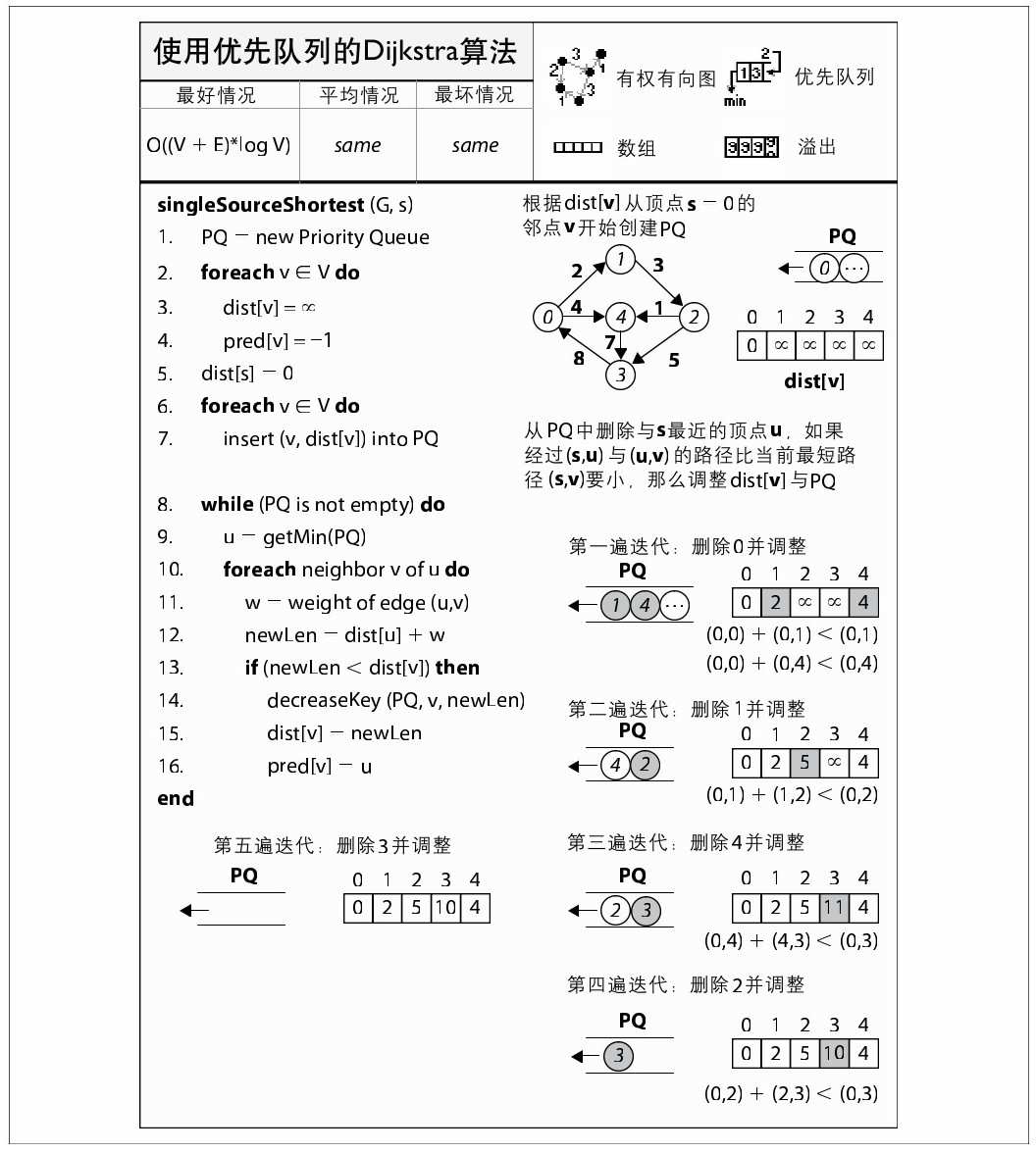 边的权值是正数,如果这个假设不是真的,那么dist[u]的值有可能会是无效的。更坏的是,如果图中存在一个负值环,Dijkstra算法可能会陷入死循环。在图6-13的第12行中,我们假设不会有算术溢出,你必须注意,简单地添加一个对newLen≥0的检查。