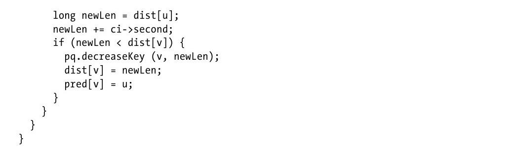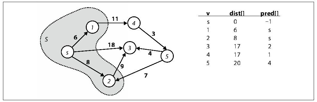 图 6-14 Dijkstra算法扩展S集在例6-3的C++实现中,我们使用了优先队列来存储V-S中的顶点。在这里优先队列是二叉堆,因为我们可以在常数时间寻找到优先级最小的顶点(优先级是顶点到s的距离)。此外,当s到v的最短路径找到之后,dist[v]的值减少,那么堆也必须修改。幸运的是,二叉堆形式的优先队列decreaseKey操作在平均情况下花费时间为O(log q),q是二叉堆中顶点的数目,q永远小于或者等于顶点的总数n。