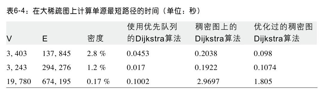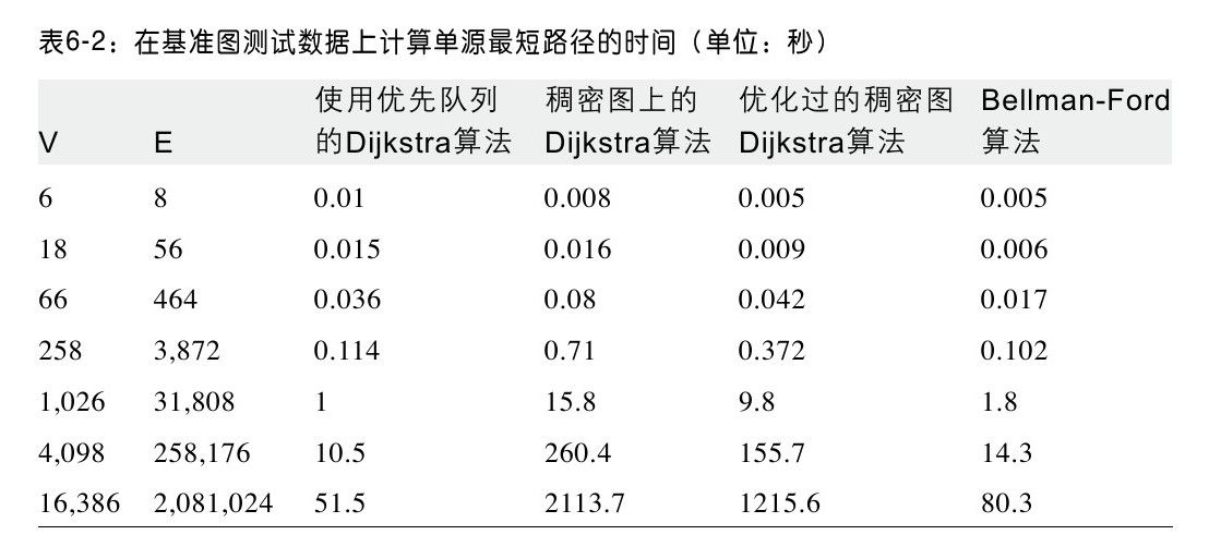 大图通常是稀疏的,图6-4的结果确认了,使用优先队列的Dijkstra算法更加适合稀疏图,为稠密图设计的实现慢10倍左右。表格中的行依稀疏图中的边数排序,因为这样可以明显地看出结果中的开销因子。